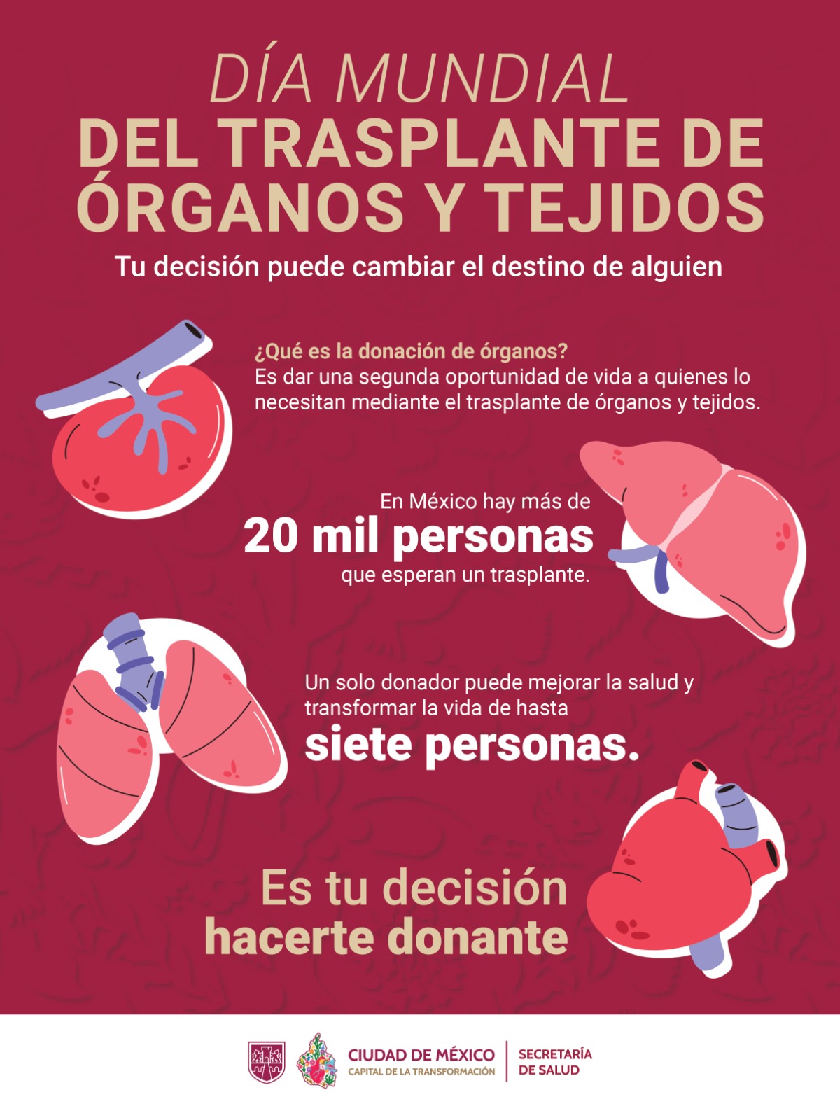 En el marco del Día Mundial del Trasplante de Órganos y Tejidos, que se conmemora este 27 de febrero, la Secretaría de Salud de la Ciudad de México (SEDESA) invita a la población capitalina mayor de 18 años a conocer más sobre el impacto positivo de donar órganos y tejidos de forma voluntaria y altruista.